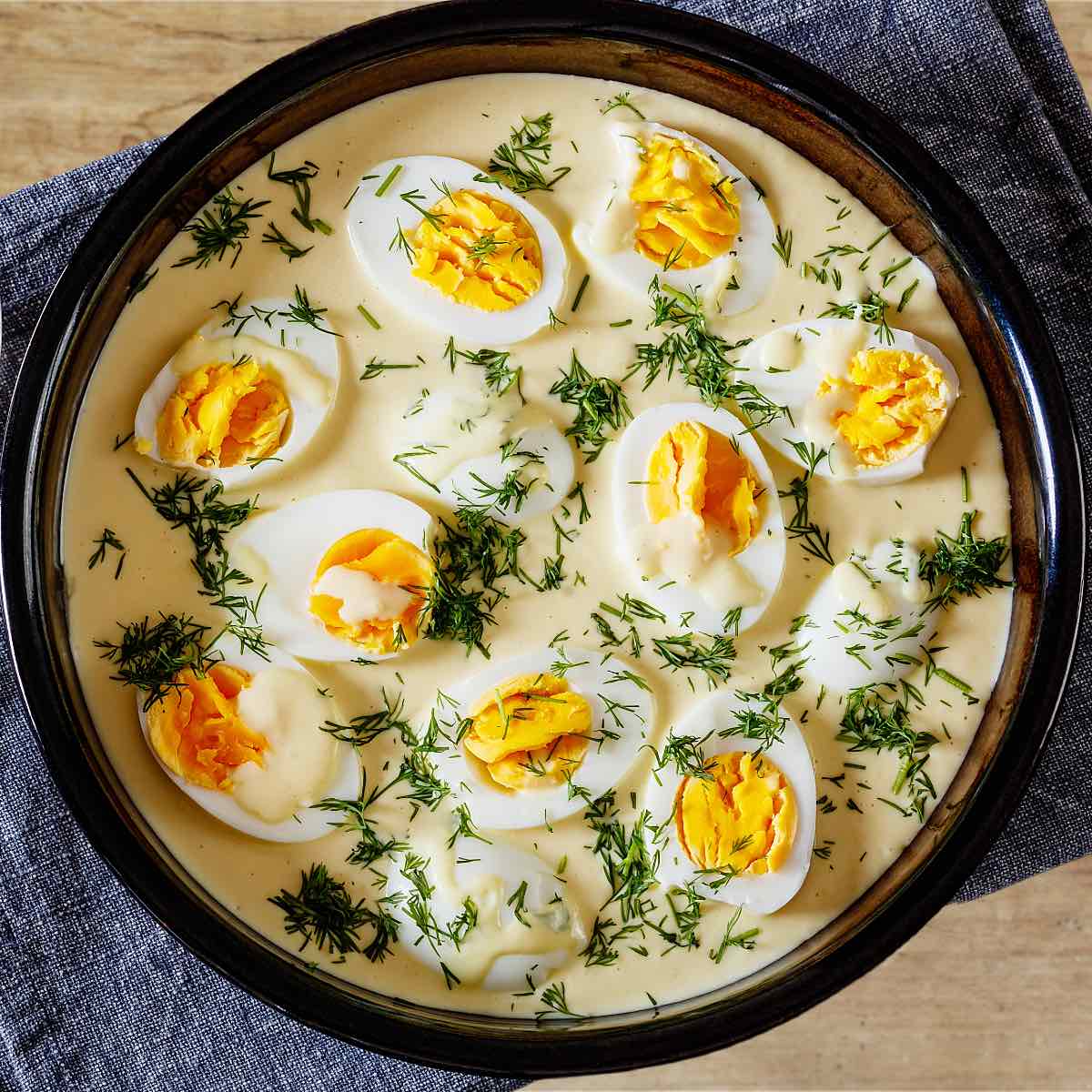 Die Eier halbieren oder ganz lassen und vorsichtig in die Senfsauce legen.